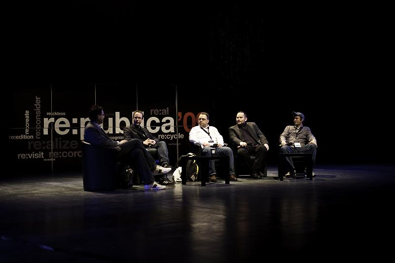 re:publica 2009: Panel zur Zukunft der Medien mit Markus Beckedahl, dem zu früh verstorbenen Robert Basic, Stefan Niggemeier, Sascha Pallenberg und mir. Foto: Daniel Seiffert.